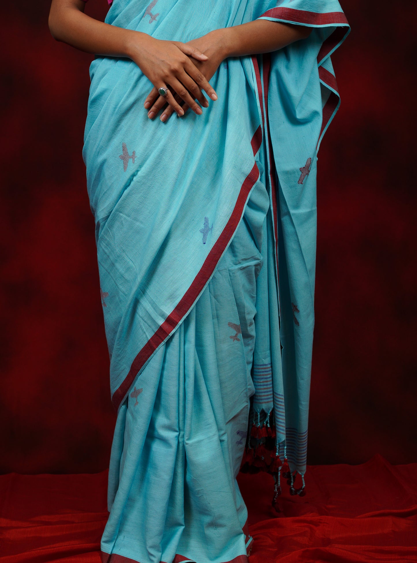 Highlights of This Product - This sky-blue saree is made of hand-spun cotton with red borders and cute red pompoms on pallu. It has aeroplane motifs in colors of Indigo and red.